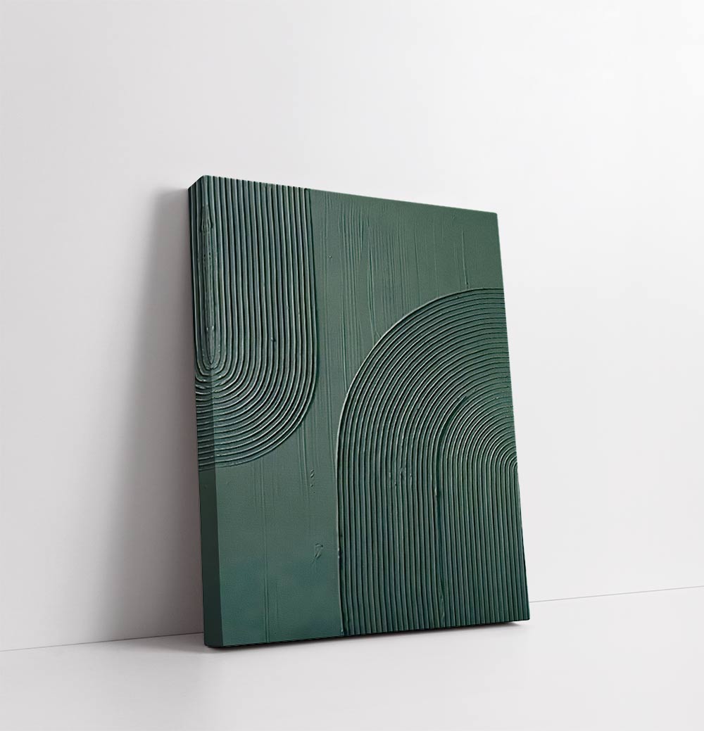 Elevate your space with the understated elegance of the "Geometric Rhythm" abstract oil painting. This minimalist piece features meticulously textured lines and curves in deep, forest green, offering a harmonious blend of simplicity and depth. The composition invites a tactile experience, as the raised lines and smooth surfaces create a rhythmic pattern that draws the eye.