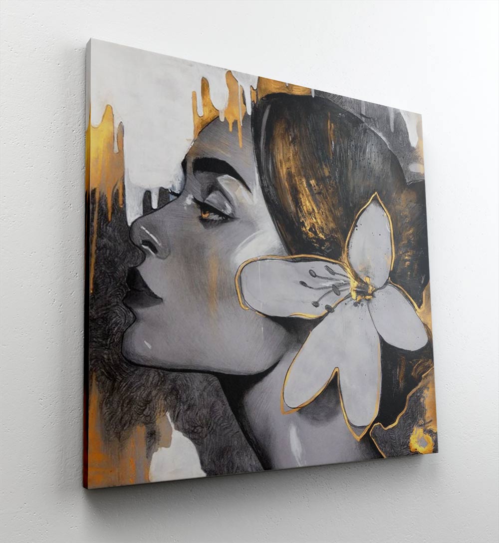 The "Golden Muse" oil painting is a stunning, contemporary portrayal of feminine strength and beauty. This elegant piece features a woman's serene profile, accented by golden hues and a delicate white flower resting against her cheek. The soft grayscale tones of the portrait contrast beautifully with the metallic gold details, creating a captivating focal point that will transform any space.