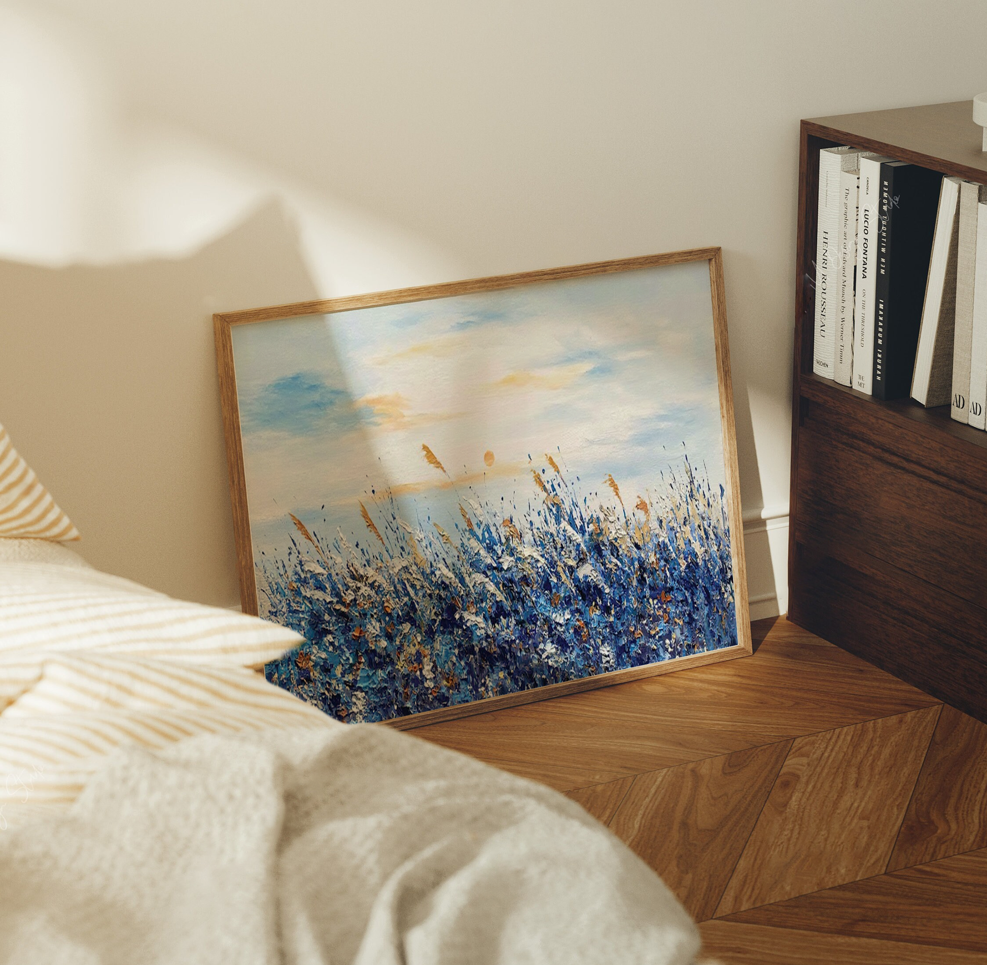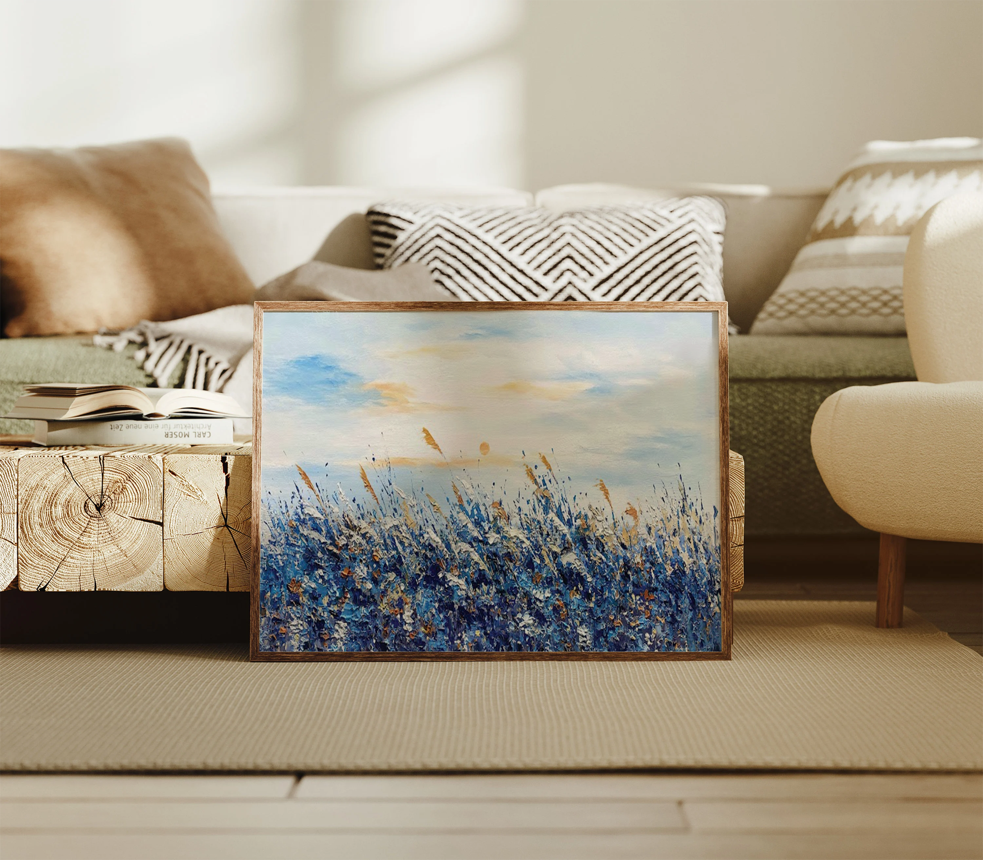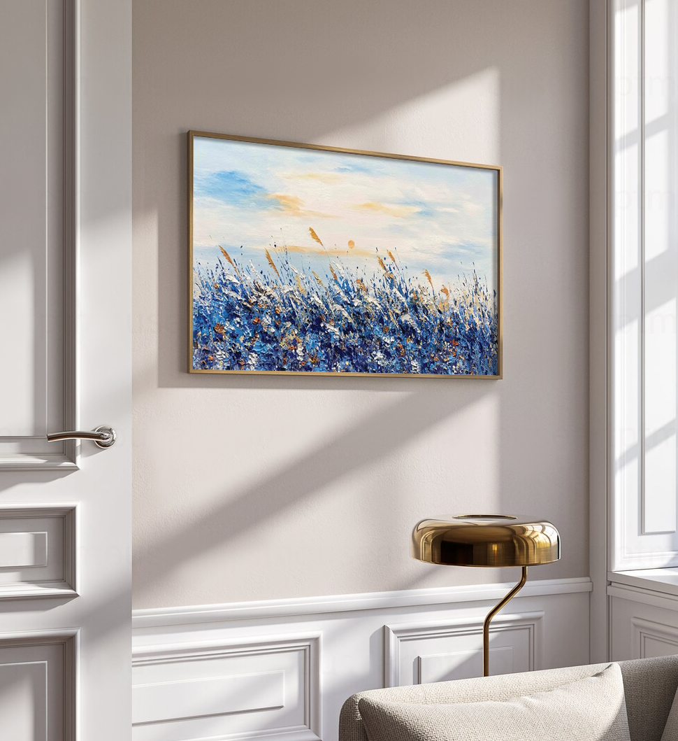 This piece captures the moment when the golden sun rises over a field of wild blue blossoms, stirred by a soft morning wind. With expressive brushstrokes and textured oil layers, every detail feels alive.